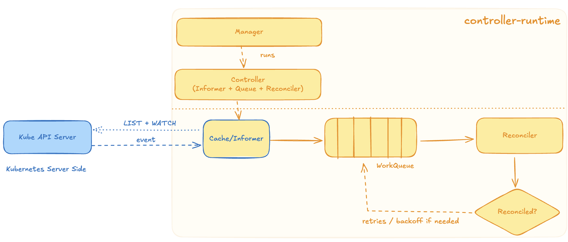 In this guide, we will focus on understanding the components behind controller-runtime and what capabilities it has to offer. Where does it fit the whole kubernetes picture? What capabilities does it provide of write operators?